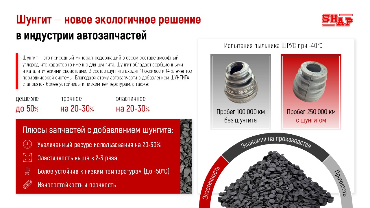 Мы нашли решение, как сделать запчасти прочнее, а их стоимость – доступнее. Благодаря использованию шунгита и передовым технологиям производства мы снизили себестоимость деталей без потери качества.